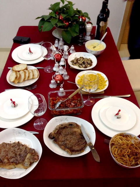I do miss the holiday season back in NY, all the X'mas decorations in the street, X'mas songs in all the shops and real warm apt with heavy snow at outdoor. Shanghai doesn't really celebrate Christmas, plus we don't even get days off for Christmas. This year is my first X'mas in Shanghai, nothing fancy and special, just cooked a real normal X'mas eve dinner (steak,mashed potato,pasta,saute mushroom, cream corn,salad and bruschetta at home with some wine and fine cheese, pretty satisfying!